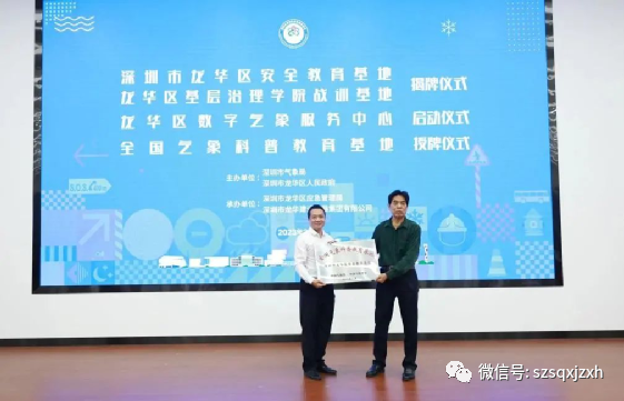 深圳市气象减灾学会会长成良玉同志为龙华区安全教育基地授匾深圳市龙华区应急管理局副局长王宁同志上台接受牌匾