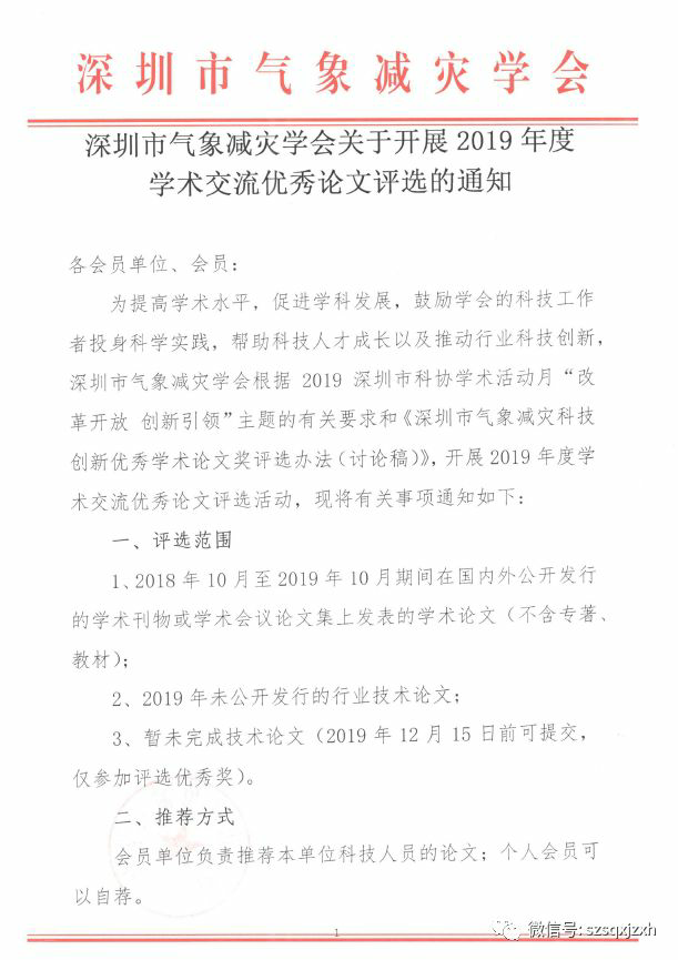深圳市气象减灾学会关于开展2019年度学术交流优秀论文评选的通知