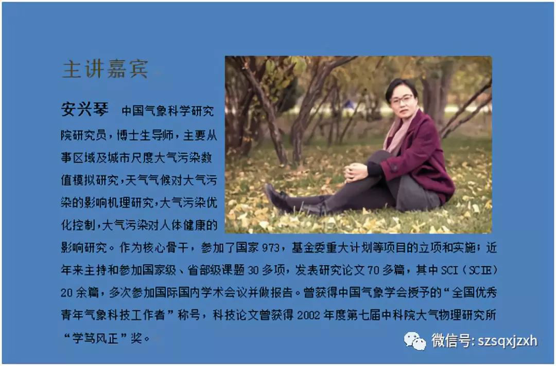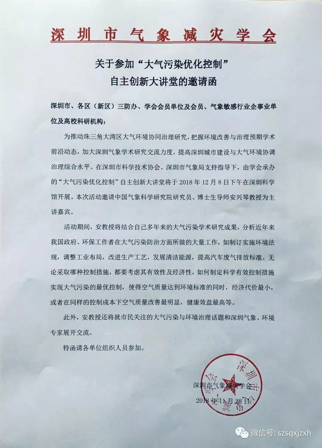 为推动珠三角大湾区大气环境协同治理研究,把握环境改善与治理预期学术前沿动态,加大深圳气象学术研究交流力度,提高深圳城市建设与大气环境协调治理综合水平。在深圳市科学技术协会、深圳市气象局支持指导下,由学会承办的“大气污染优化控制”自主创新大讲堂将于2018年12月8日下午在深圳科学馆开展。本次活动邀请中国气象科学研究院研究员、博士生导师安兴琴教授为主讲嘉宾。